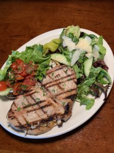 An ahi tuna filet is rubbed with garlic oil and cracked black pepper then grilled and served on grilled Macrina rustic sourdough bread with a watercress tartar sauce, lettuce and our fresh cherry tomato and kalamata olive relish. Served with a side salad tossed in truffle vinaigrette with sliced cucumber and shaved reggiano cheese.