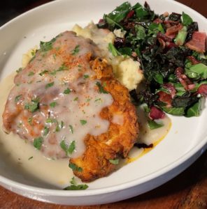 A boneless, free range chicken breast is dredged in egg, buttermilk and seasoned flour then browned in the skillet and finished in the oven. Served over garlic yukon gold mashed potatoes and topped with house made country chicken gravy with a side of sautéed greens with bacon.