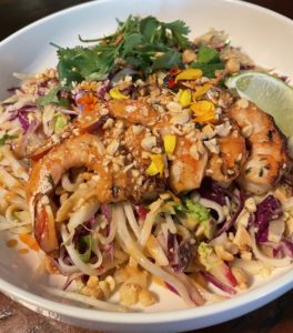 Wild, jumbo prawns are marinated in chilies, lime, herbs and seared then served on a bed of rice noodles tossed with peanut dressing, shredded red cabbage, napa cabbage, red pepper, radish, bean sprouts, carrots and green onions topped with cilantro, peanuts and a lime wedge.