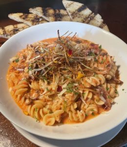 Thick smoked bacon is sliced and sautéed with leeks, garlic and fresh rosemary, deglazed in white wine and tossed with crushed tomatoes, French goat cheese and fusilli pasta. Topped with parmesan cheese and crispy fried leeks. Served with grilled sourdough bread .