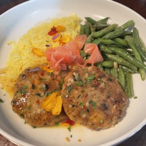 Fresh halibut is blended with garlic and ginger, hand formed into two cakes then sauteed and finished with a reduced sauce of sake, lime, orange, butter and herbs. Served with our saffron jasmine rice, sesame green beans with a pickled ginger garnish.