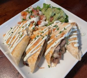 Flank steak is marinated in cumin, chipotle pepper and lime juice, grilled and layered in a large flour tortilla with jack cheese then pan fried. Topped with our pico de gallo salsa, cilantro sour cream and house made guacamole.