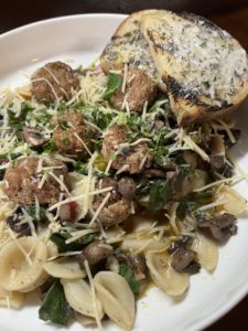 Cascioppo Brother’s ground veal, pork and thick cut bacon are mixed with minced onions, garlic, herbs and spices then formed into meatballs and baked in the the oven. Tossed with orecchiette pasta with sautéed rainbow swiss chard, chicken stock and roasted wild mushrooms in a rich white wine sauce with a touch of butter and lemon. Topped with parmesan cheese and served with a side of garlic bread.