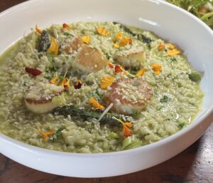 Jumbo scallops are pan seared with fresh asparagus and blended with a creamy risotto of leeks, garlic, fresh basil, crushed red chili flake, lemon, italian parsley, white wine, rich vegetable stock and finished with butter and parmesan cheese. Served with a side mixed green salad tossed in our balsamic vinaigrette.