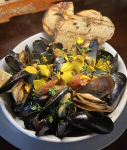 Large Mediterranean mussels are sautéed with Caccioppo Brother’s hot chorizo sausage, garlic and italian parsley then simmered in a tomato-chardonnay broth and served with grilled Macrina sourdough bread