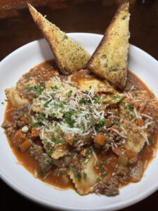 Fresh cheese raviolis are tossed in house made meat sauce of ground bison, ground pork, carrots, onions, celery, tomatoes, rich chicken stock and white wine. Topped with reggiano parmesan and served with toasted garlic bread.