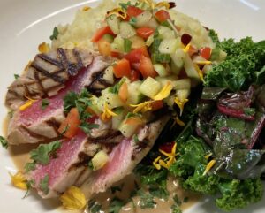 A fresh sushi grade ahi tuna filet is grilled and placed on a bed of mashed sweet potatoes and topped with our soy butter sauce then topped with our fresh cucumber relish. Served with a side of sautéed greens.