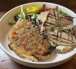 A sushi grade ahi tuna filet is rubbed with cracked black pepper then grilled and served on grilled Macrina rustic sour bread with rosemary and lemon aioli and our roasted red pepper and herbed onion relish. Served with a side salad tossed with blood orange-serano dressing.