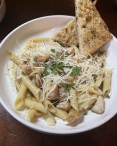 Diced, organic, free range chicken breast, crispy fried sage, seared prosciutto, capers and lemon are sautéed in a white wine butter sauce then tossed with penne pasta and parmesan cheese, served with toasted garlic bread.