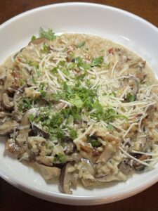 Creamy aborio rice is blended with sautéed seasonal mushrooms, pancetta, herbs, garlic, crushed red chile flake, chicken stock, heavy cream and finished with butter. Topped with reggiano parmesan cheese.