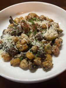 Fresh sweet potato gnocchi are tossed with sautéed, organic free range chicken breast, crimini mushrooms, oven roasted brussel sprouts, crushed red chile flake, garlic and sage in a brown butter sauce. Topped with grated parmesan reggiano cheese.