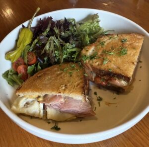 Black Forest ham is piled on Macrina Bakery’s sliced sourdough with honey mustard, sliced brie cheese and house made sweet onion relish then grilled until golden brown. Served with a wild green salad tossed with blood orange-serrano vinaigrette.