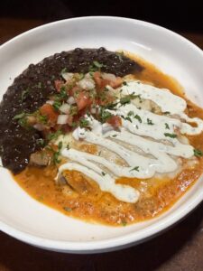 Corn tortillas are layered with grilled flank steak and jack cheese then smothered with Hipolito’s spicy habanero-pineapple sauce and baked in the oven then topped with cilantro sour cream and pico de gallo salsa. Served with a side of drunken black beans.