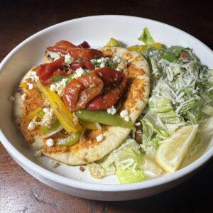 Marinated chicken breast is julienned then sautéed with onions and bell peppers then piled on warmed pita bread with house made muhammara spread, crumbled feta cheese and Mama Lil’s pickled peppers. Served with a side caesar salad.