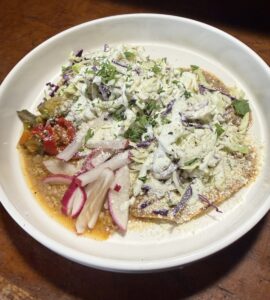 Ground pork is simmered with tomatillos, green chilies, garlic, chicken stock and cumin then stacked on fried corn tortillas with our refried beans, shredded cabbage, radishes, house made pickled jalapeños and cotija cheese with sour cream.