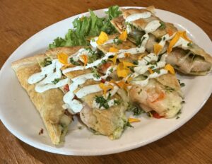 A large flour tortilla stuffed with prawns, roasted red peppers, Monterey Jack cheese and our house made cilantro pesto, then grilled and served with lime sour cream.